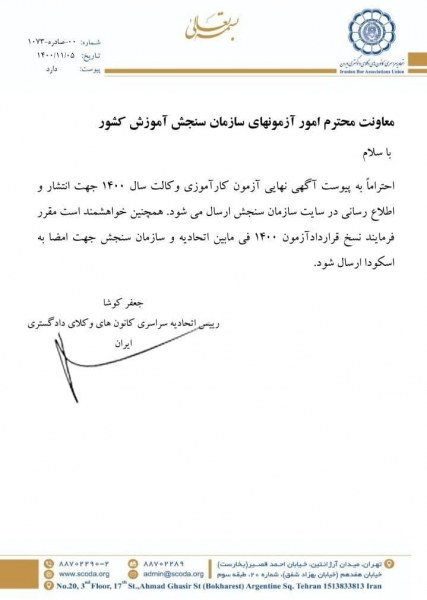به گزارش عدلنامه، اسکودا متن آگهی آزمون وکالت ۱۴۰۰ ارسال شده به سازمان سنجش را منتشر کرد.